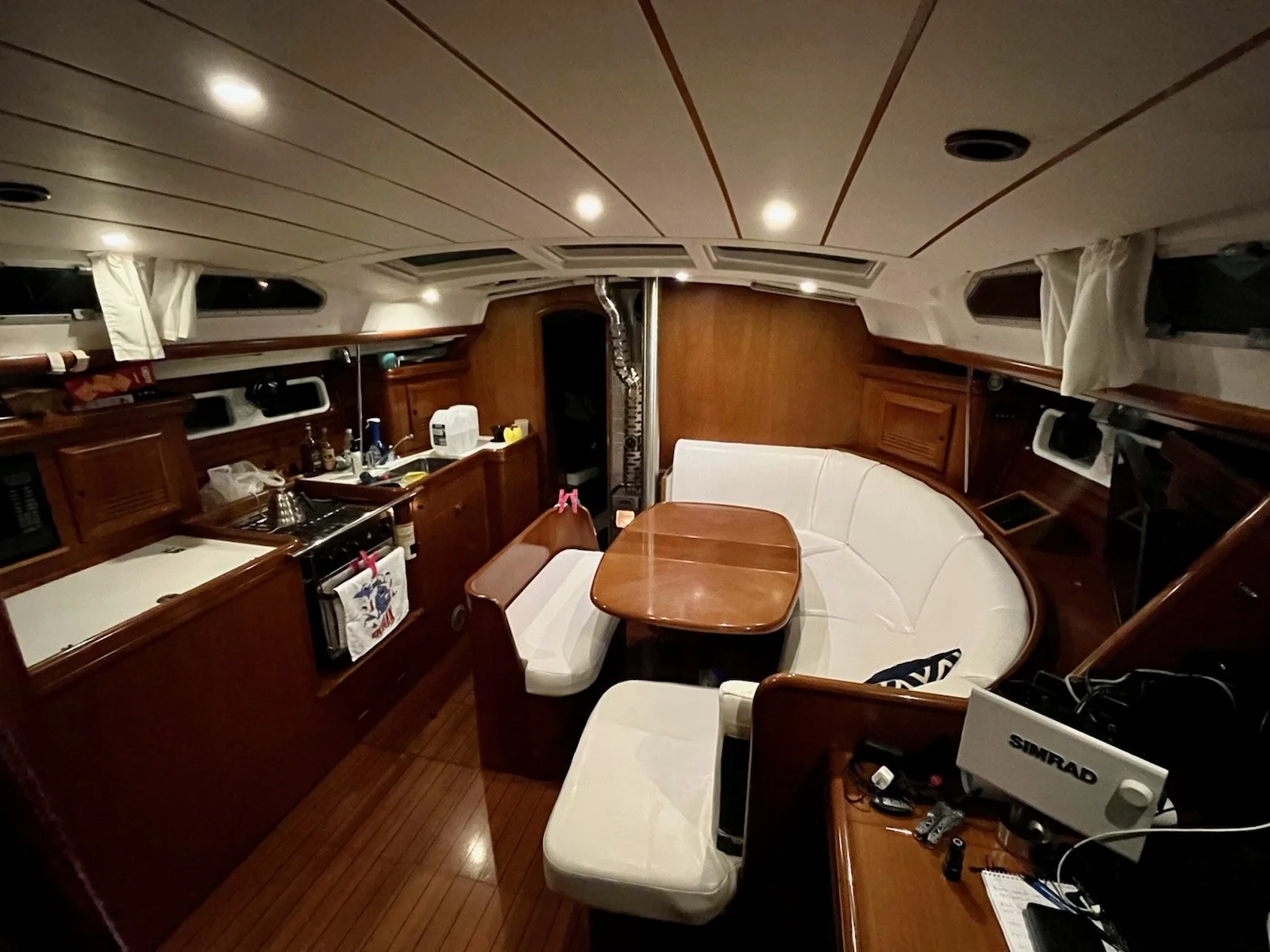 This boat is really well equipped for adventure! The former owners took wonderful care of the vessel and added some great features to the boat, including a fireplace! Look closely toward the forward section of the salon (living area) and you’ll see a small box with a warm glow. That’s the diesel heater making the boat nice and toasty!